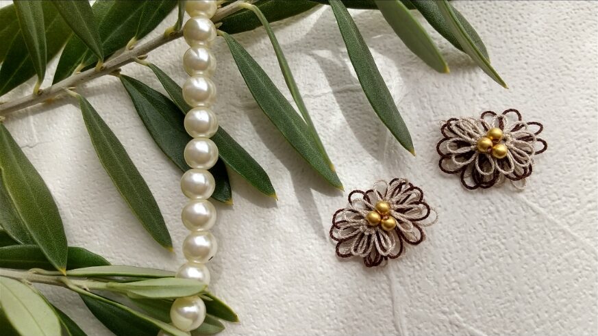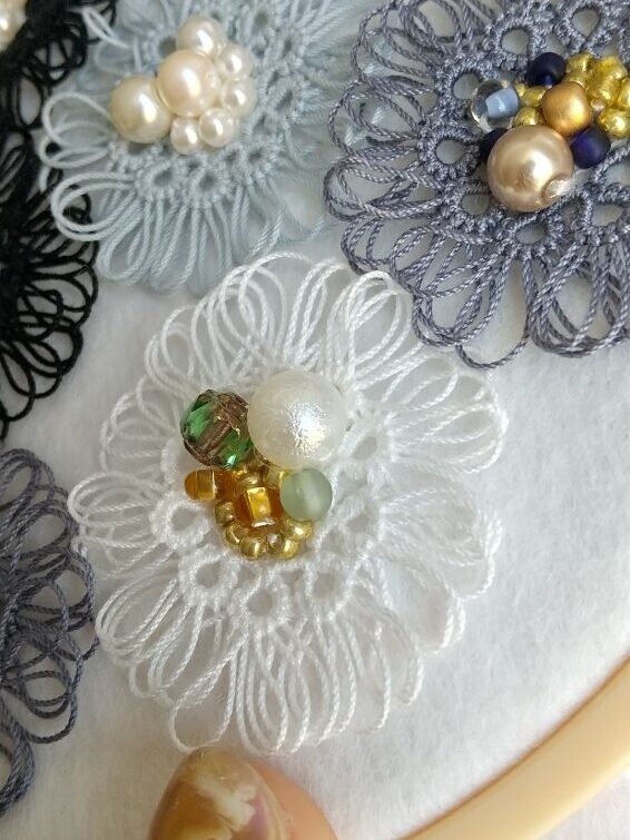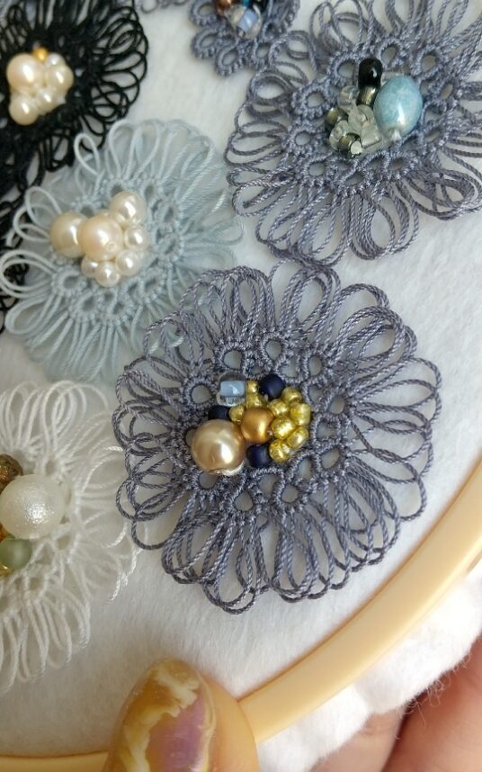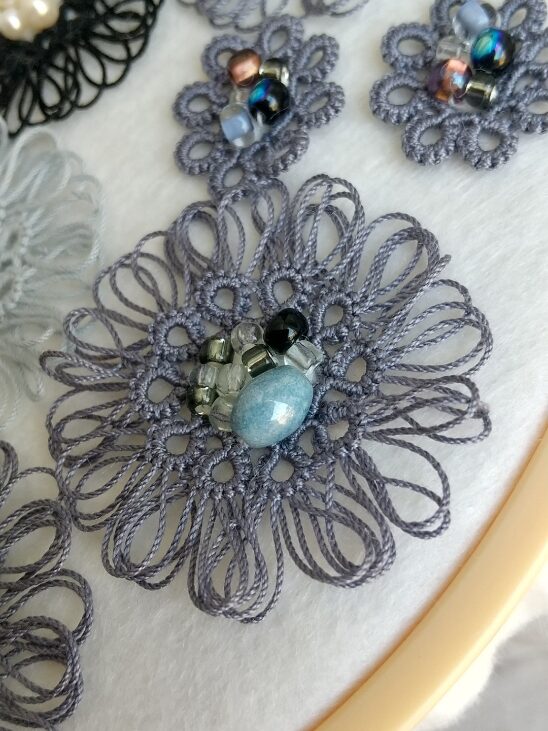 グレージュの糸にブルー系のビーズを合わせています。