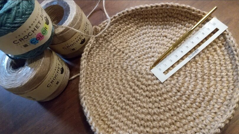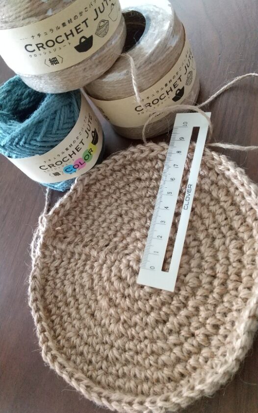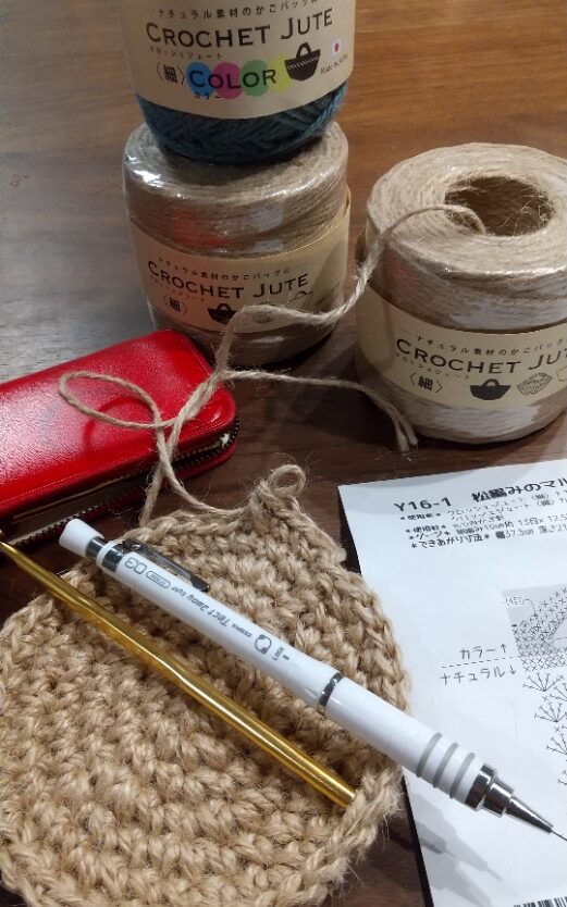 ジュートはゴワゴワして硬いので、編むのに力が要ります(汗)