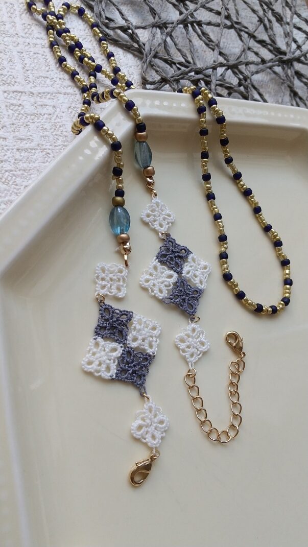 ちょうど耳元でタティングレースのモチーフが揺れて