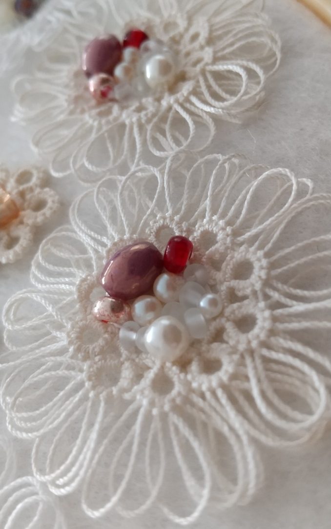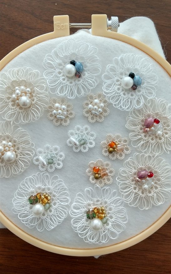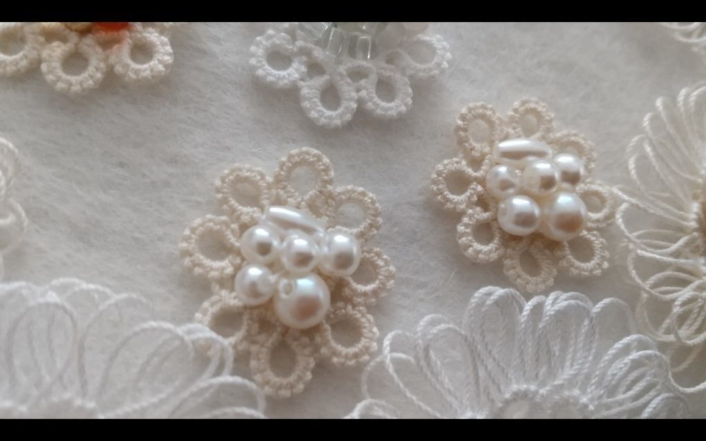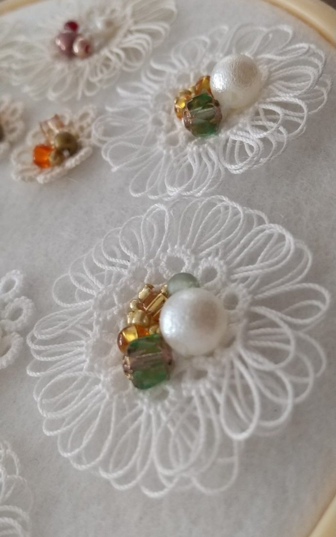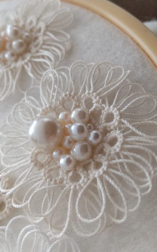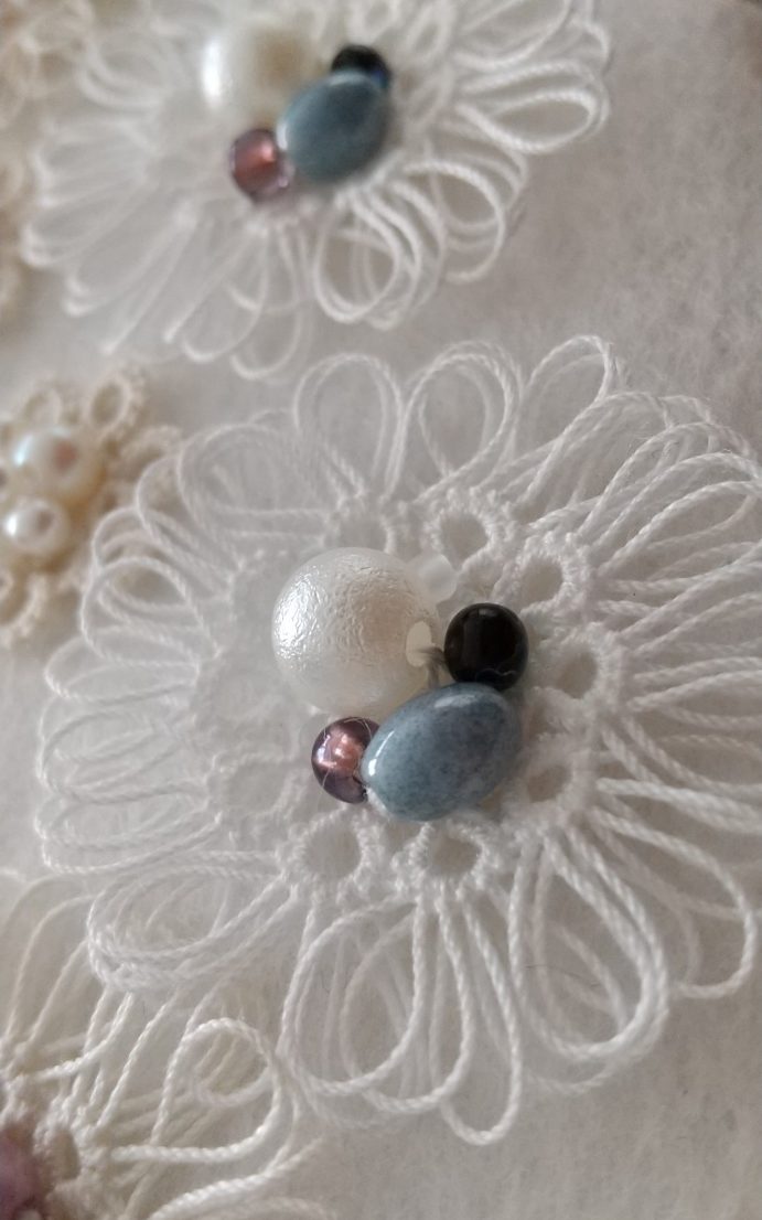 オフホワイトの糸に大小、形も様々なパールを合わせた作品です。