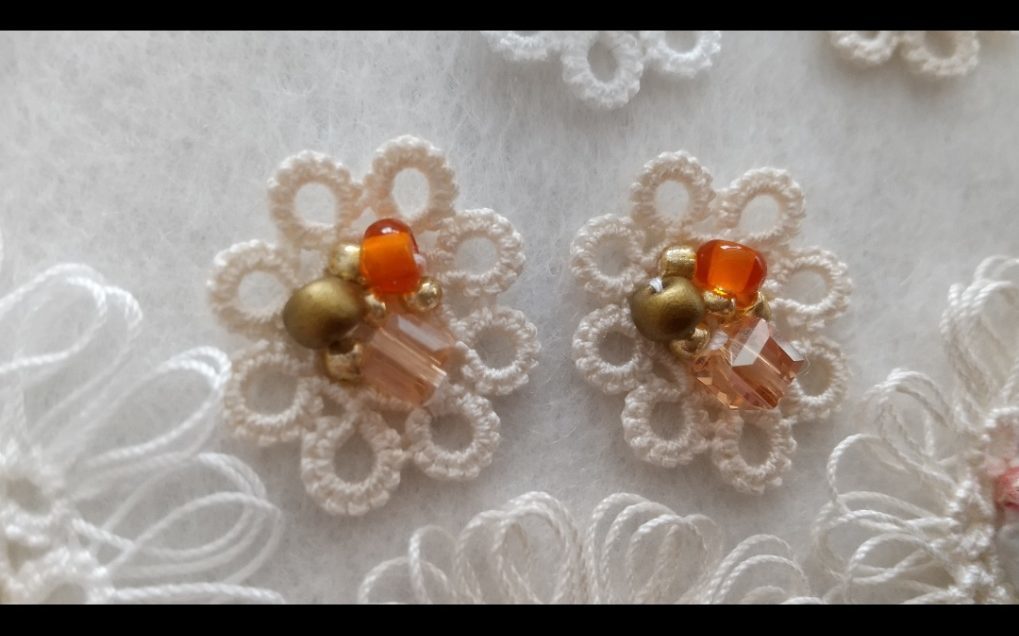 オフホワイトの糸にオレンジとゴールドのビーズを合わせました。