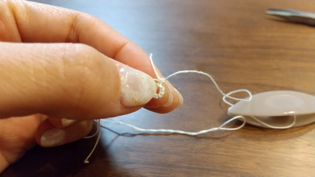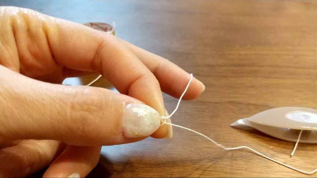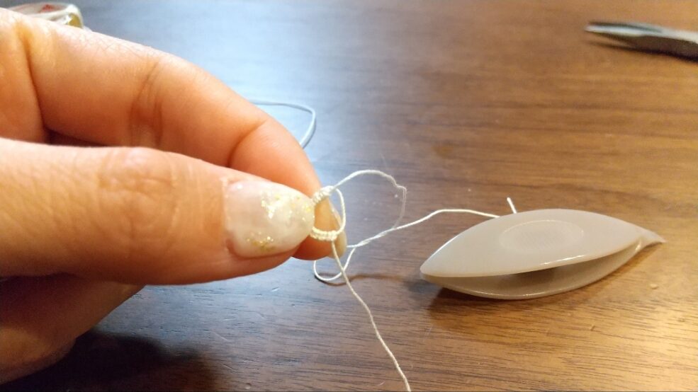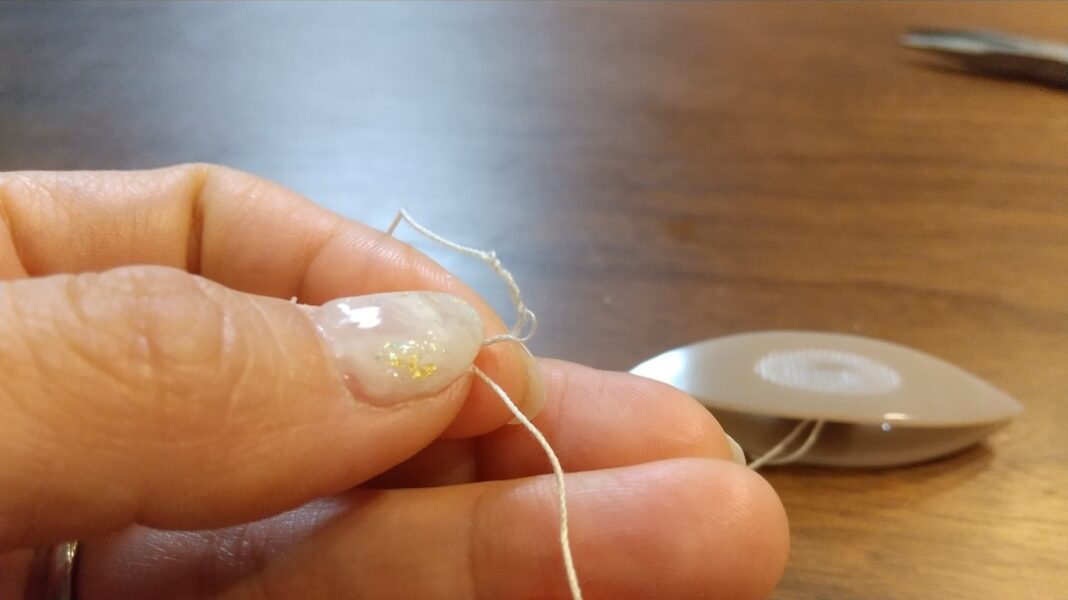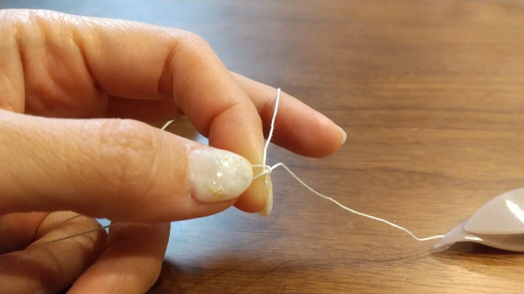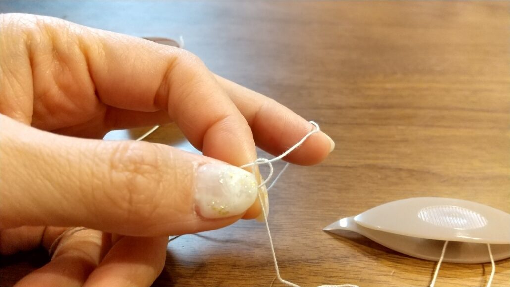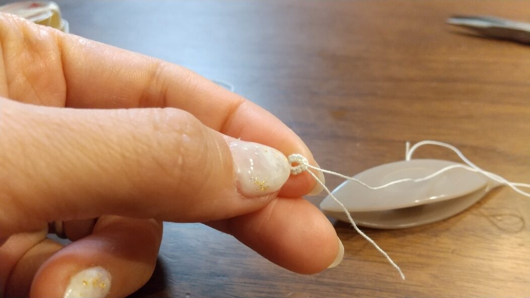 こちらの画像のようにリングは糸をしっかり引っ張って、最後まで輪を閉じてください。