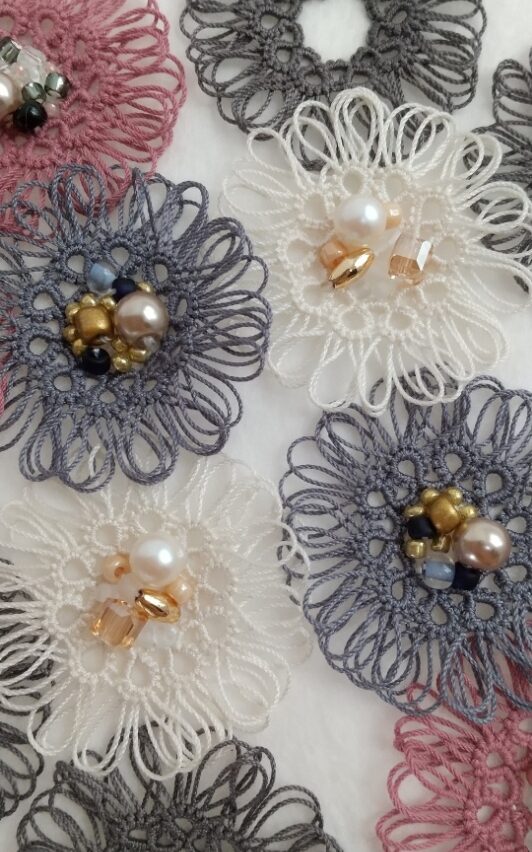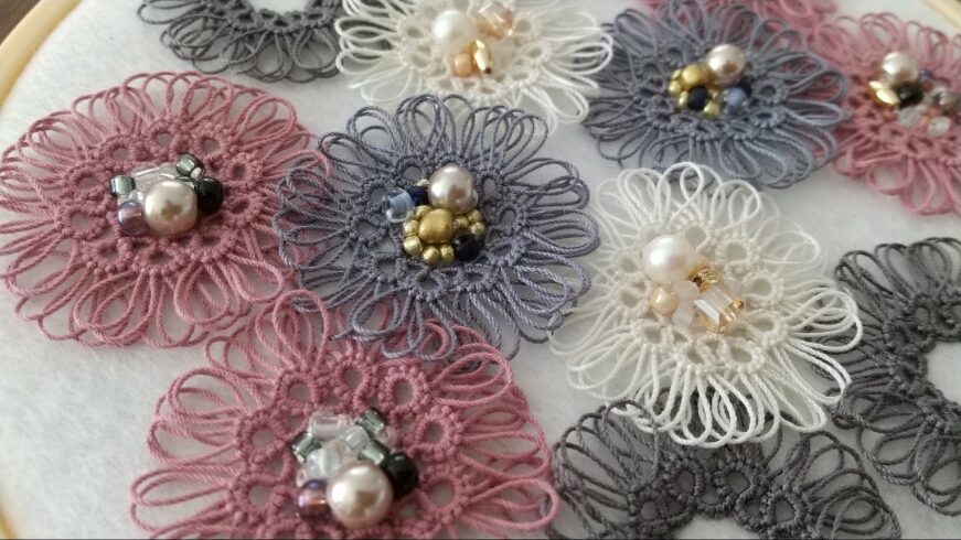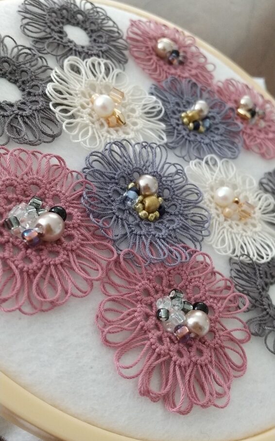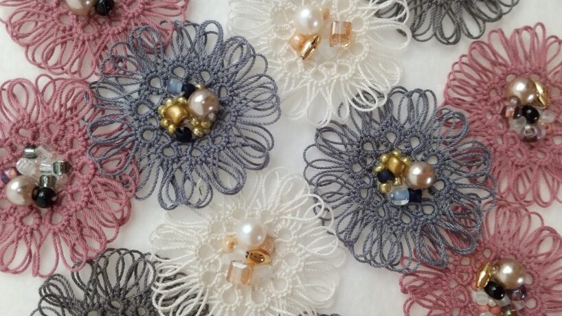 続いて、ホワイトの糸と優しいベージュ系のビーズを合わせたこちらの作品です。