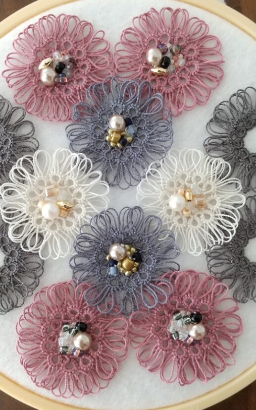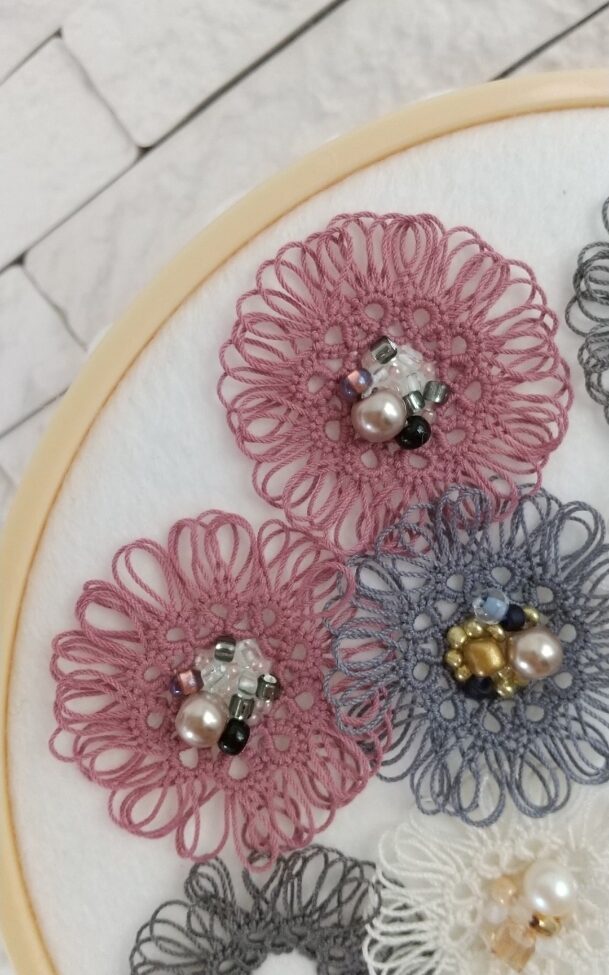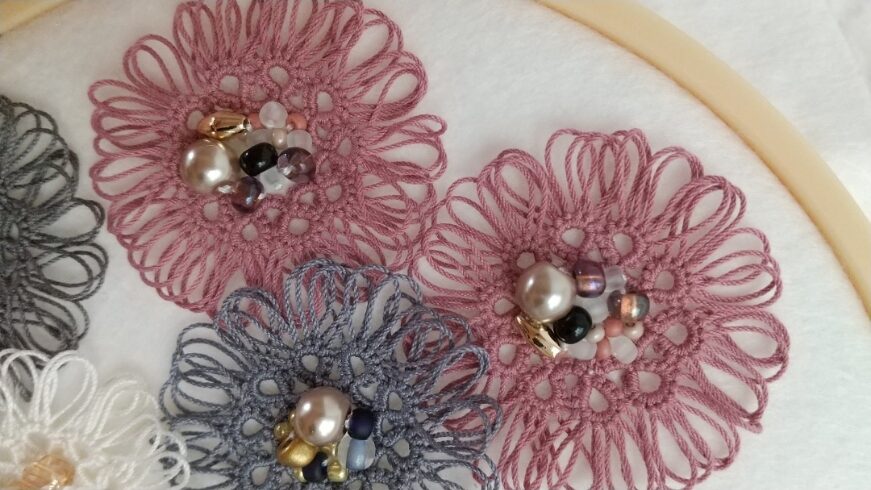 春らしいピンクの糸と、ベージュのパールを合わせました。